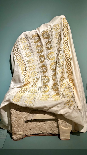 It is a handmade fabric with a Greek cotton warp, Cretan silk weft and Japanese gold thread. It was woven in 2024.